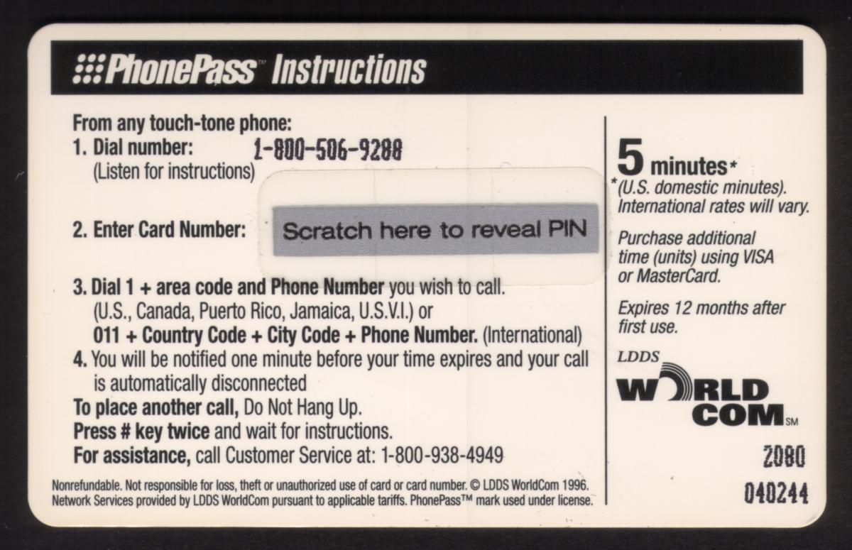 Since we have the world's largest inventory of USA phonecards for collectors, you will not necessarily receive the identical serial/batch/PIN number that we have scanned/pictured.