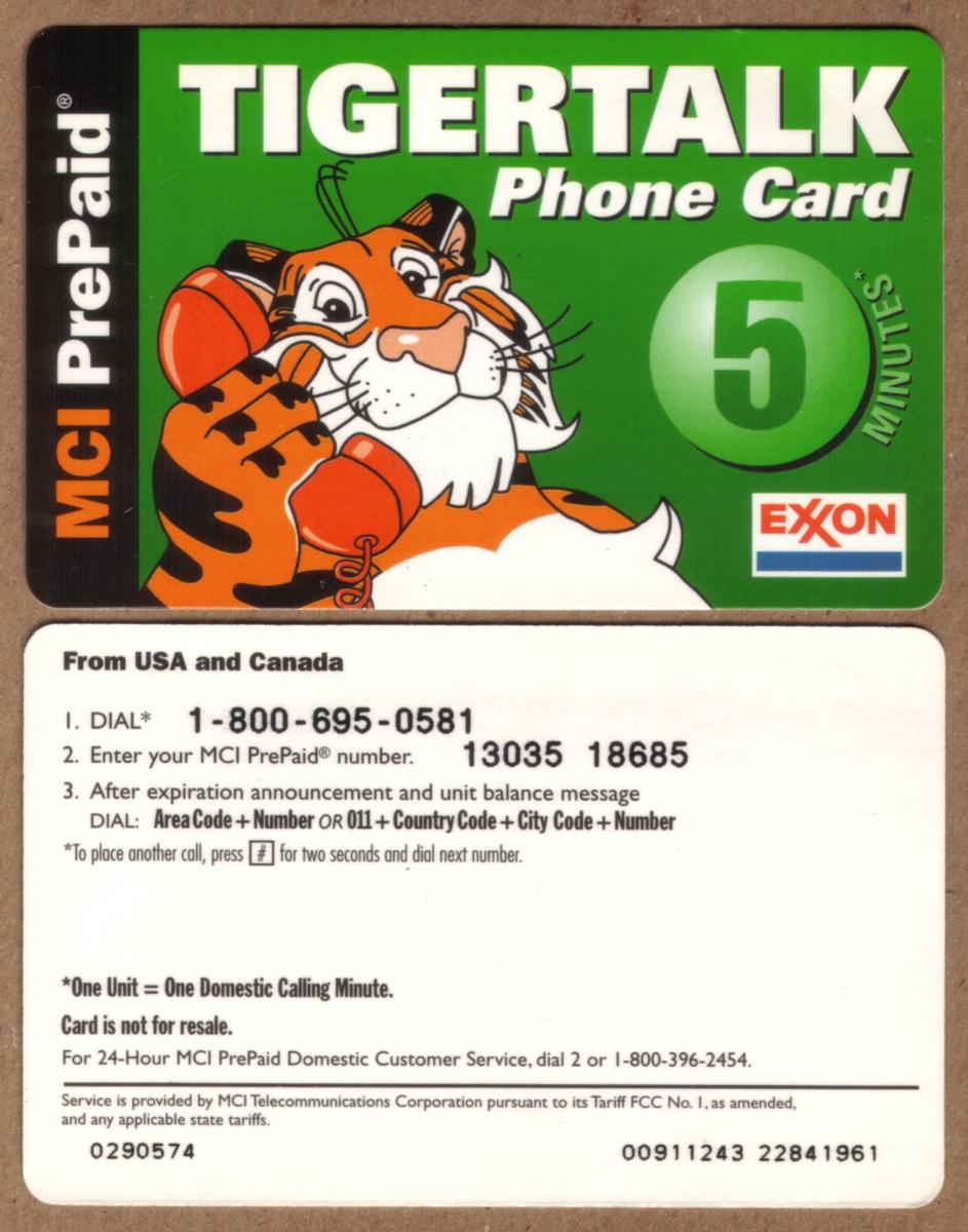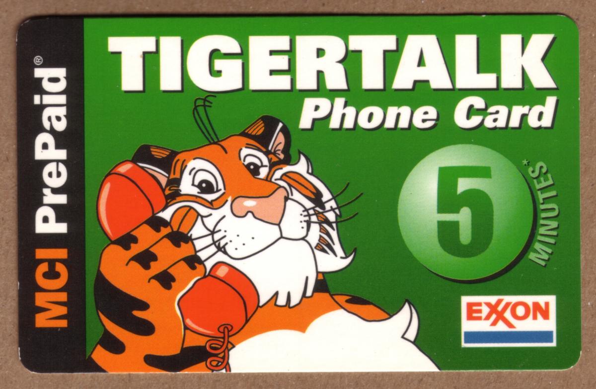 A playful vintage TigerTalk card featuring a cheerful cartoon tiger with bold orange stripes, promoting 5-minute calls with Exxon branding and MCI prepaid services. |