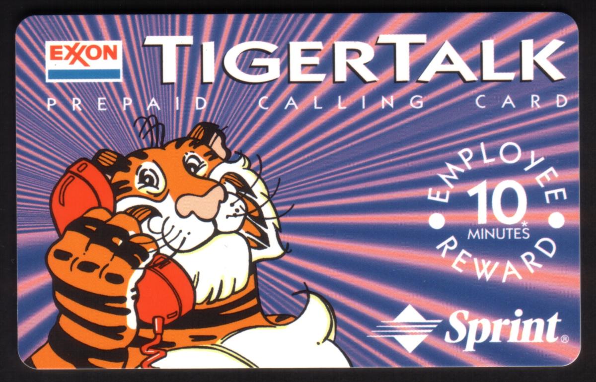 This prepaid calling card is promotional and tied to Exxon employee rewards. It connects themes of gasoline, transportation, and wild animals through its branding and imagery, specifically highlighting the tiger as a mascot for the TigerTalk phone service. The card is a collectible item related to automotive and telecommunications industries.