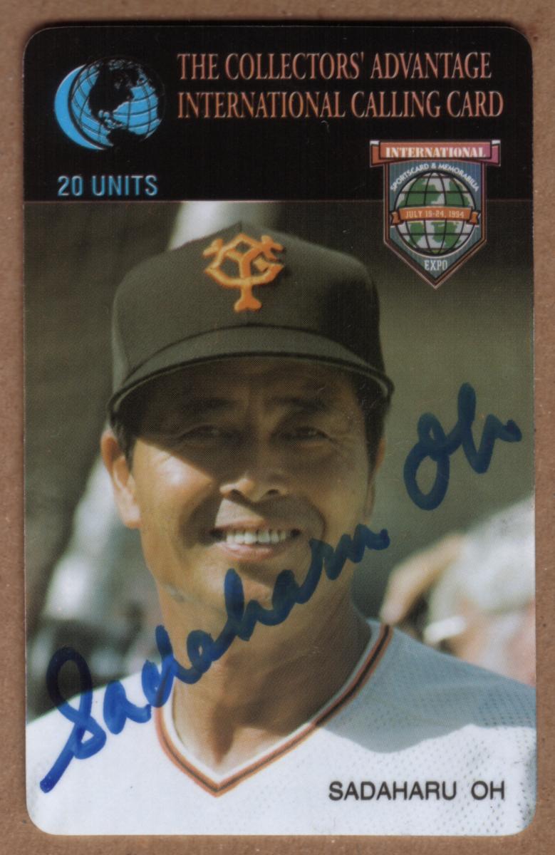 This collectible phone card features a photographic portrait of Sadaharu Oh, the renowned Japanese baseball star, smiling and wearing his team's cap with a distinct orange logo. The card includes an original autograph signed in blue ink across the lower left side of Sadaharu Oh's image. The text "SADAHARU OH" appears in capital letters at the bottom right corner of the card.