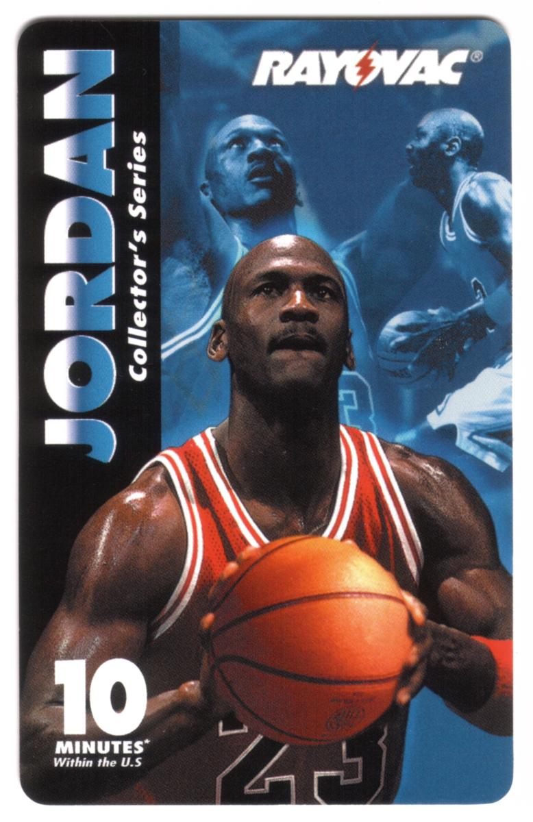 To the left side of the card is a vertical black sidebar with white text reading "JORDAN Collector's Series." The top right corner of the card shows the Rayovac logo in white and red. Near the bottom left, the card states "10 MINUTES Within the U.S," indicating its phone card usage time. This card is part of a collector’s series related to basketball and Michael Jordan, associated with MCI Telecommun. Corp. and WorldCom.