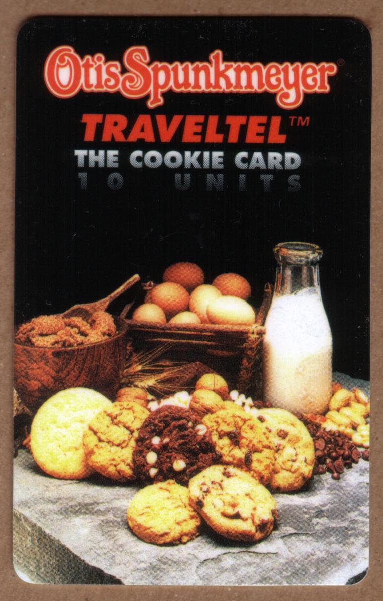 The card includes the text "Otis Spunkmeyer" prominently at the top in red and white lettering. Below this, in bold orange and white text, it reads "TravelTel" and "The Cookie Card," with "10 Units" indicating the card's value. The background behind the text is black, which contrasts with the colorful food items in the foreground.