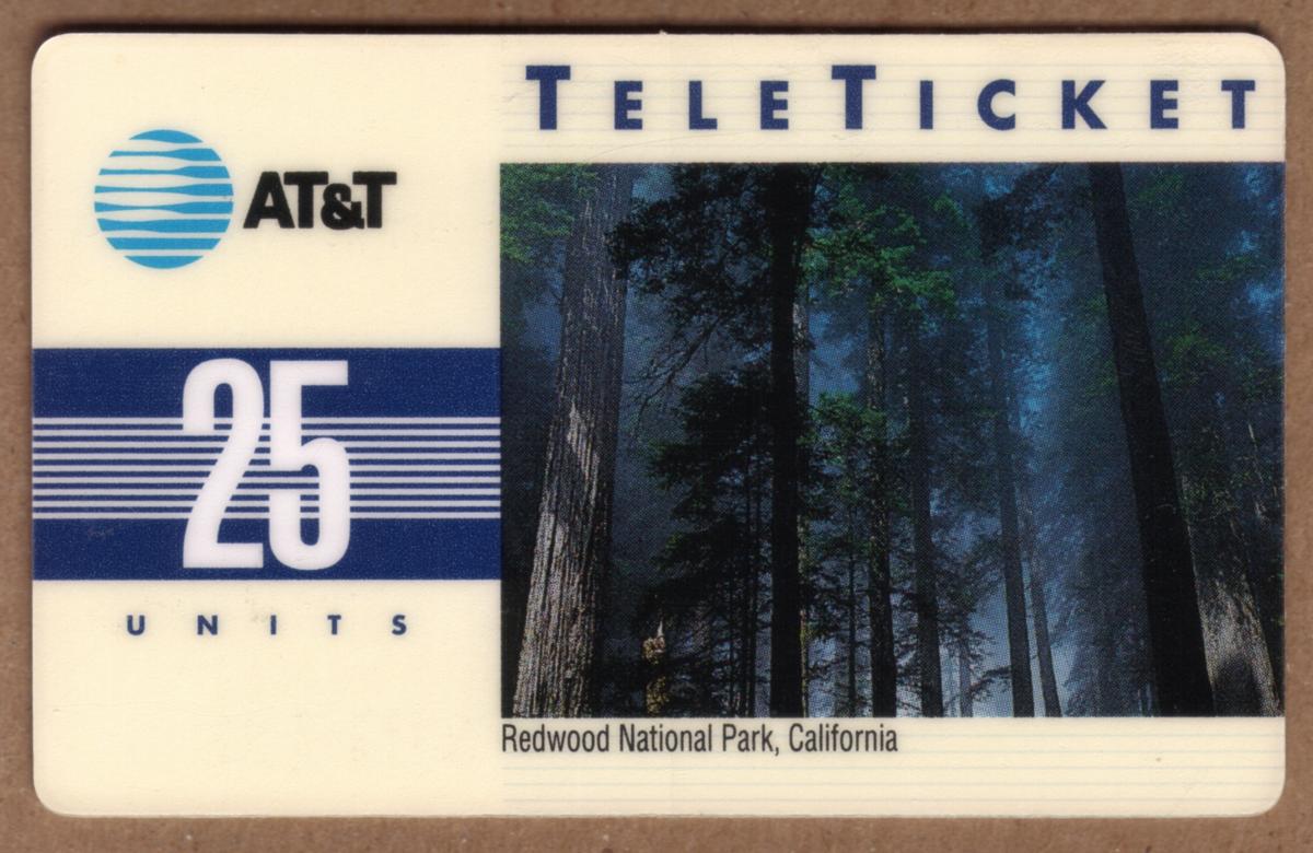 This collectible phone card is an AT&T Teleticket featuring a scenic and natural image from Redwood National Park in California. The front of the card displays towering Redwood trees set against a clear sky, emphasizing the park’s lush natural environment with abundant trees and plants. The photograph captures the grandeur and height of the redwoods, highlighting the dense foliage typical of this national park.