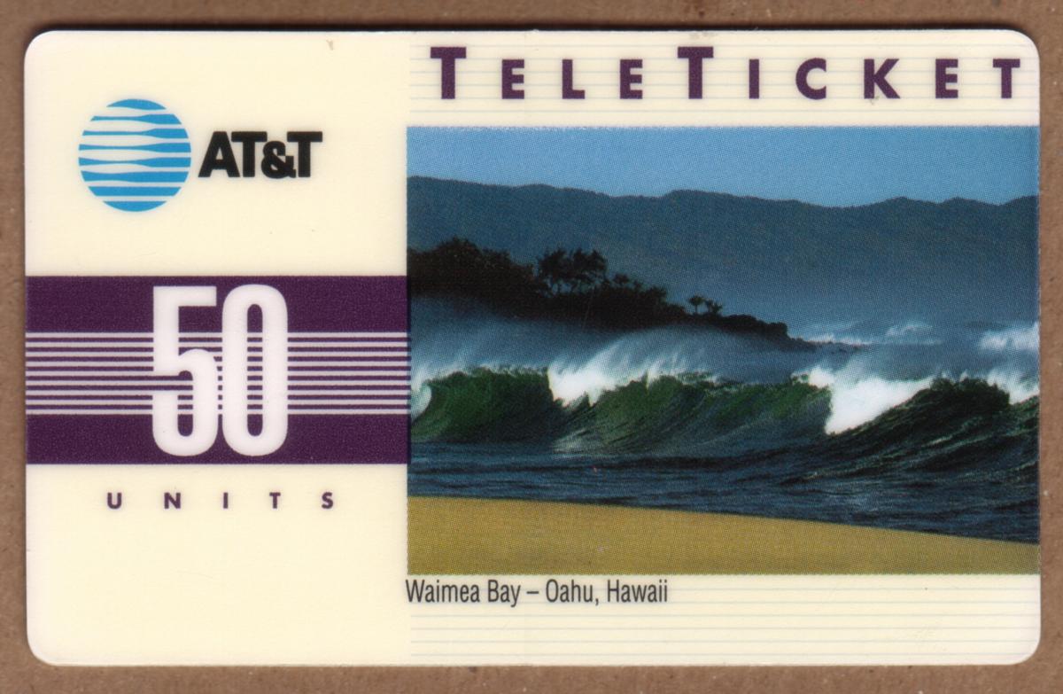 The card displays the words "Waimea Bay - Oahu, Hawaii" prominently in the upper right corner, confirming the location. The card is identified as an AT&T Teleticket phone card with a value of 50 units. Additional text includes "Group 3" and "English USED," indicating its classification and language. The AT&T logo is visible on the card, reinforcing the brand connection.