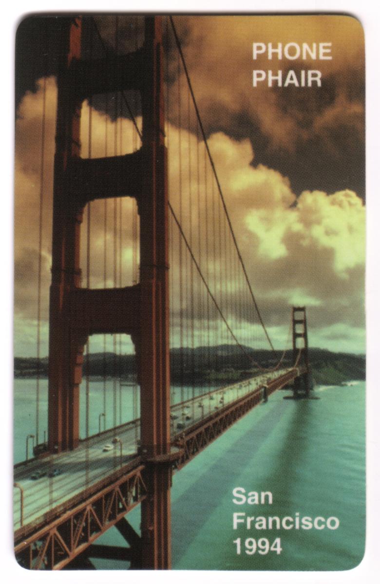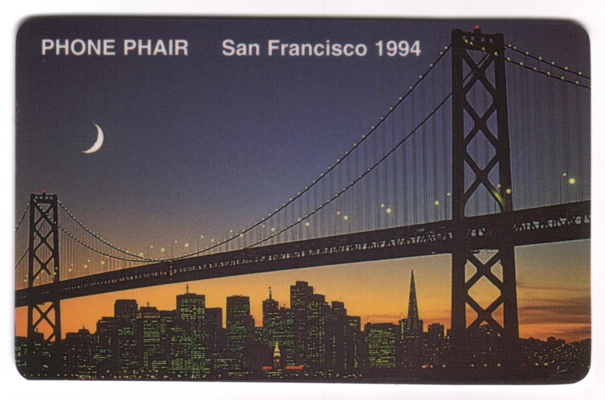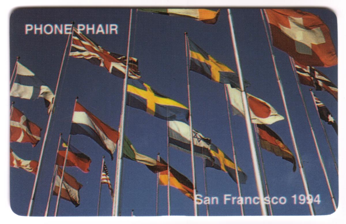 Together, these cards celebrate the 1994 Phone Phair event with prominent San Francisco landmarks and international flags, linking the city’s iconic structures and global connections.