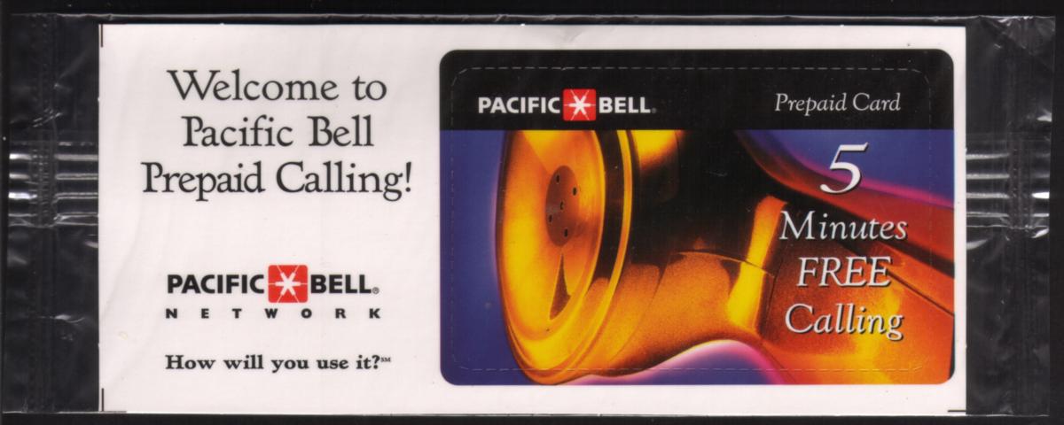To the right of the receiver image, the card displays the text "5 Minutes FREE Calling" in a large white serif font, with "5 Minutes" stacked above "FREE Calling." The left portion of the card holder or packaging contains the text "Welcome to Pacific Bell Prepaid Calling!" above the Pacific Bell logo, which repeats the red star emblem and includes the word "NETWORK" beneath it. Underneath that, the question "How will you use it?" is printed in black font.