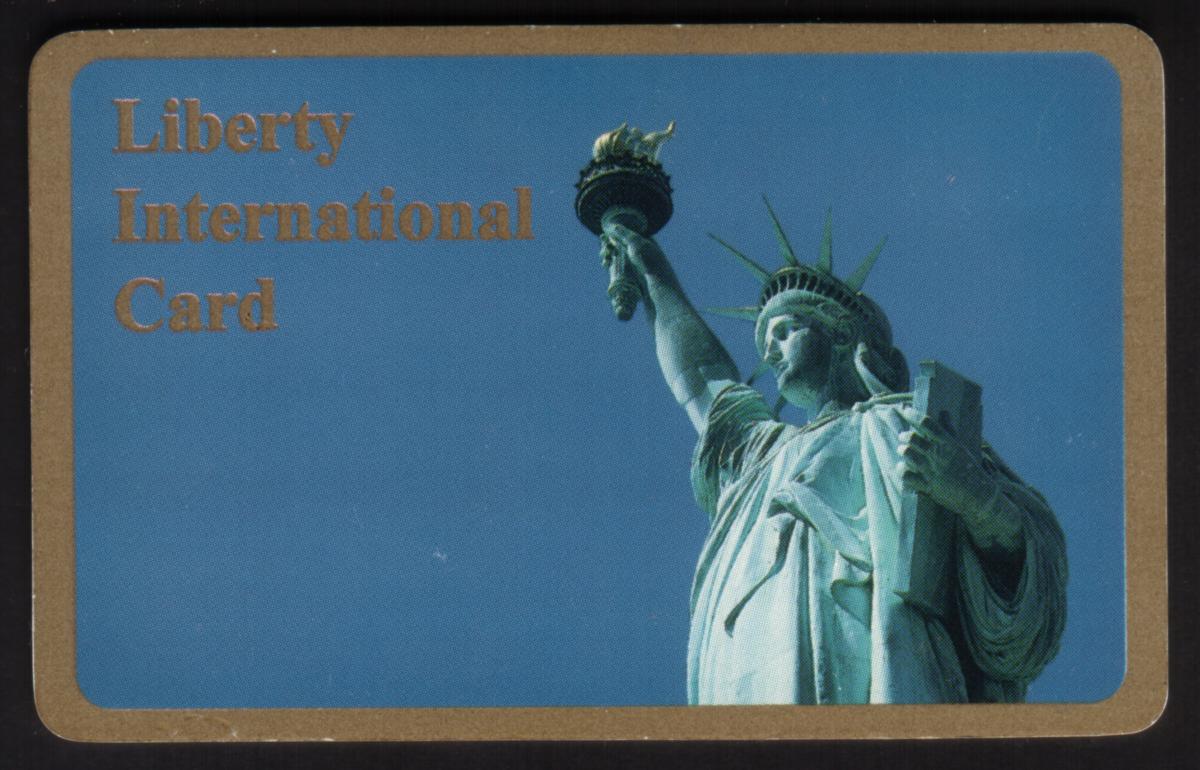 The card has a gold border around the edges and gold text on the left side that reads "Liberty International Card." The statue’s greenish-blue patina contrasts with the solid blue background and the gold lettering, emphasizing its prominence as a symbol of American history and freedom.