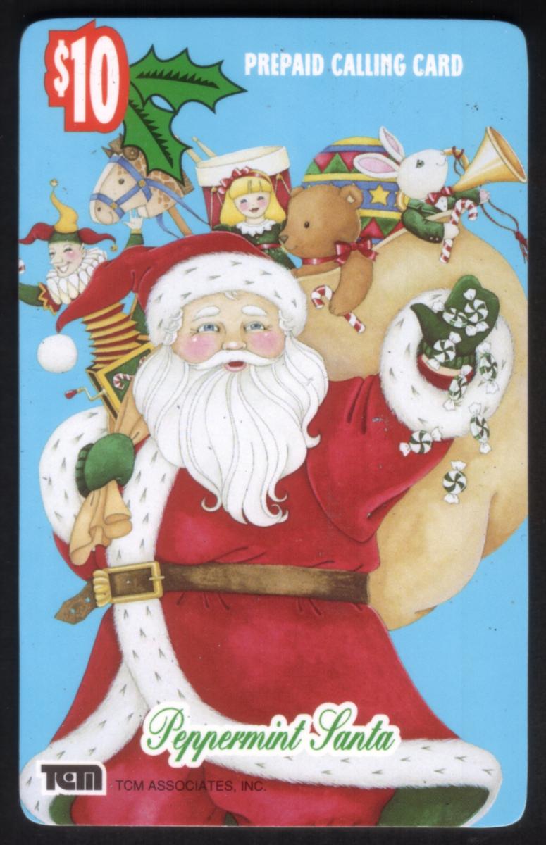The background of the card is a bright blue, making the vibrant colors of the characters and gifts stand out. At the top left corner, the value "$10" is prominently displayed inside a red shape, alongside the text "PREPAID CALLING CARD" in white. Below Santa near the bottom center of the card is the wording "Peppermint Santa" written in green cursive script. The company name "TCM Associates, Inc." appears in black near the lower-left corner, next to the "tcn" logo.