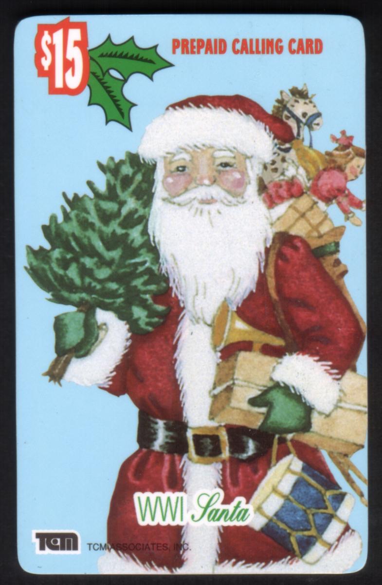 At the top left corner, the card displays a bright red price tag of "$15" accompanied by a green holly leaf, symbolizing the Christmas theme. The text "PREPAID CALLING CARD" is printed in orange along the top right edge of the card. Below Santa, the text "WWI Santa" is visible, combining "WWI" in green and "Santa" in script, linking this design to a World War I Christmas motif. The bottom left corner shows the logo and company name "TCM ASSOCIATES, INC." in small print along with "tan."