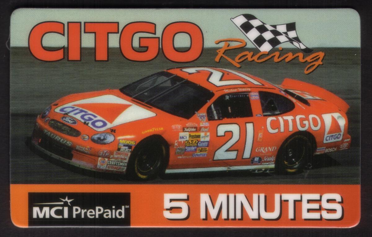 This collectible phone card features a detailed image of Michael Waltrip's NASCAR race car, number 21, sponsored by CITGO Racing. The car is an orange Ford Taurus with prominent white CITGO logos on the hood, sides, and rear quarter panels. The vehicle is shown on a racetrack with visible sponsor decals on the front fender and door area, emphasizing its authentic racing appearance.
