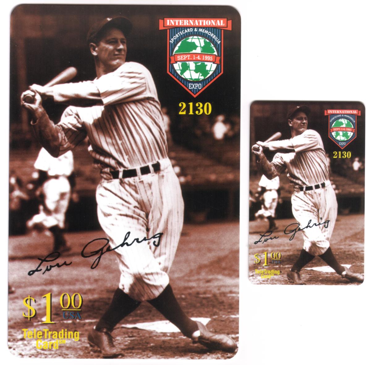 This collectible TeleTrading card features a sepia-toned image of Lou Gehrig in a classic batting pose, wearing a pinstriped baseball uniform and cap. The card is part of the International Sportscard & Memorabilia Expo 1995, held from September 1-4, 1995, as noted by the expo logo displayed at the top right. The number "2130" is printed below the logo.