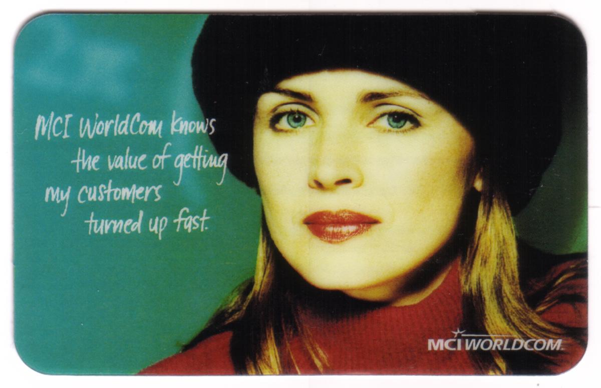 In the lower right corner, the MCI WorldCom logo appears in white, confirming the card's association with the telecommunications company. The photograph and text emphasize the promotional message highlighting MCI WorldCom's customer service and speed.
