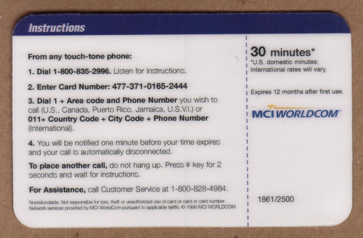 This generic user card offers 30 minutes of usage, as indicated in the keywords, and is intended as a collectible item from the late 1990s telecommunications promotional campaign by MCI WorldCom.