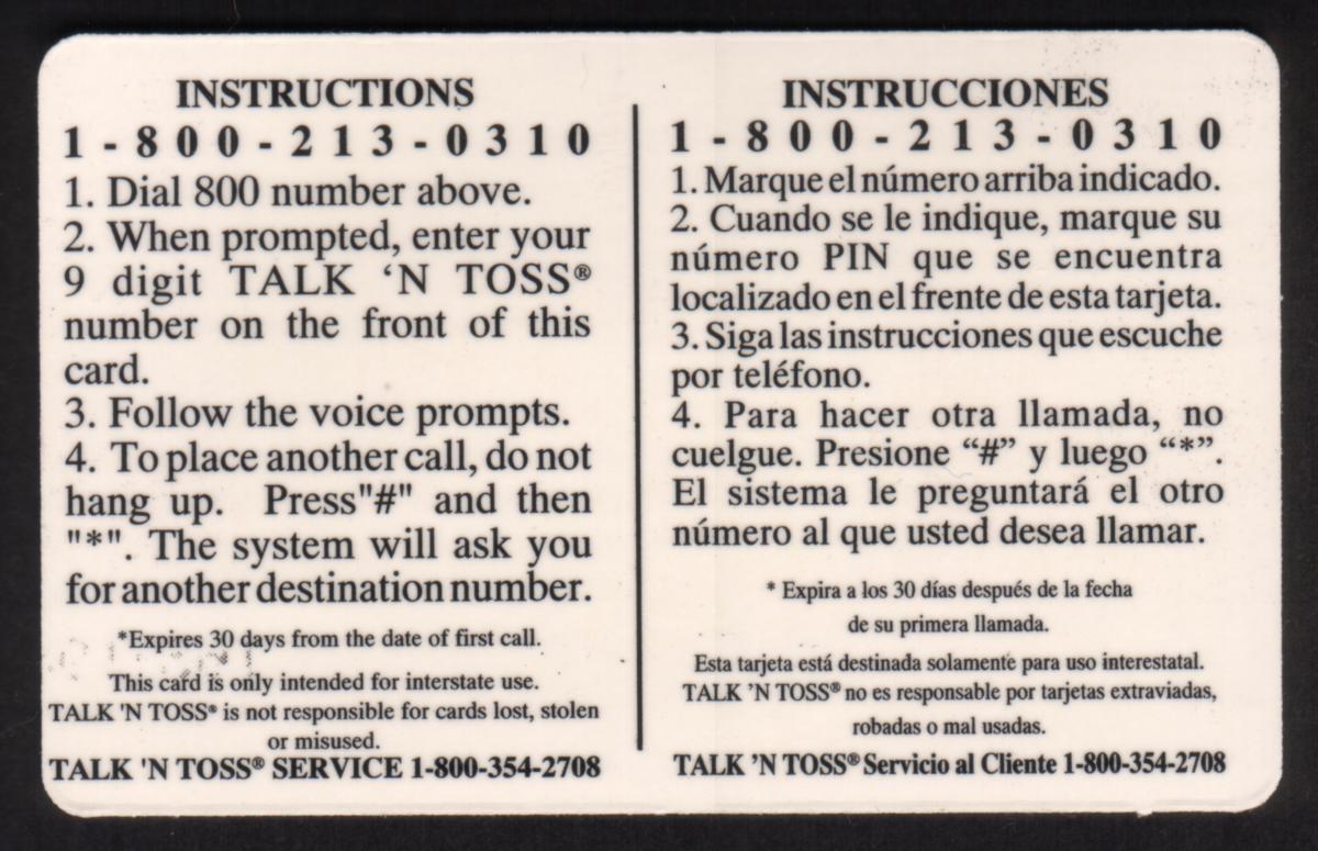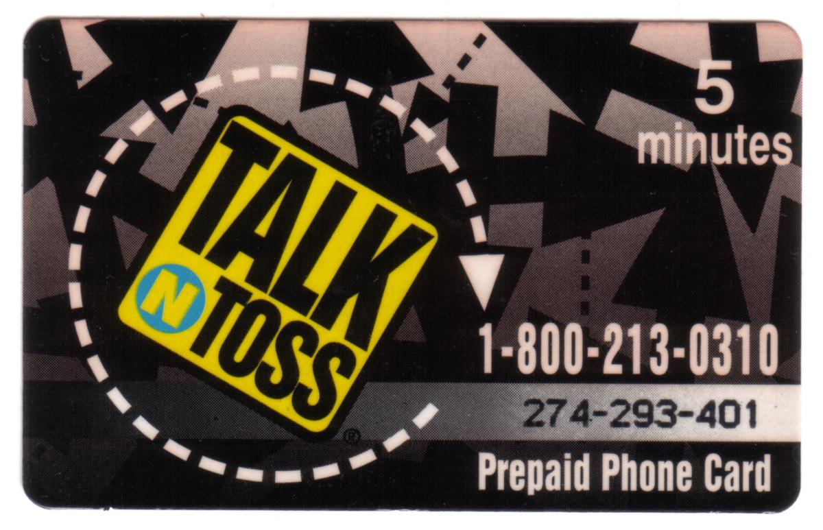 This card is related to the Talk-N-Toss promotion, identified as a promotional, generic user card with the theme centered around the Talk-N-Toss brand. The design is clear and functional, intended for prepaid phone use with a specified time allowance.