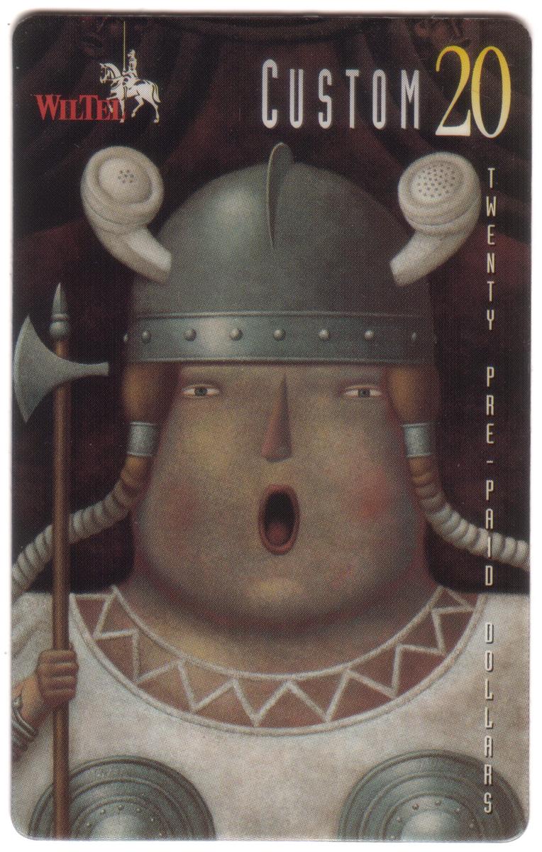 The $20 card shows a stylized human figure wearing a medieval-style helmet equipped with telephone handsets on either side, resembling an unusual mix of armor and telephone devices. The figure holds a staff and is dressed in a geometric-patterned garment.