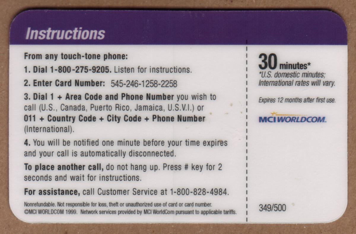 Since we have the world's largest inventory of USA phonecards for collectors, you will not necessarily receive the identical serial/batch/PIN number that we have scanned/pictured.