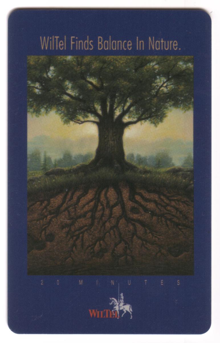 At the top of the card, gold text reads “WilTel Finds Balance In Nature.” Near the bottom, the card states “20 MINUTES” indicating the card’s usage duration or value. The WilTel logo is positioned beneath the time notation, featuring a stylized figure on horseback. The background of the card outside the tree illustration is a dark blue color, providing contrast to the natural imagery and the gold text. The overall theme reflects harmony between technology, represented by WilTel, and the natural world, symbolized by the Tree of Life and its roots.