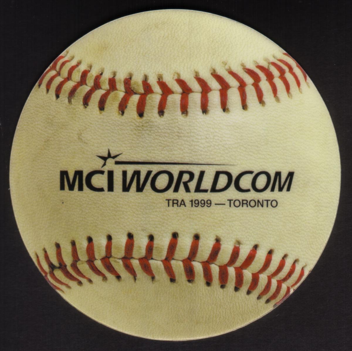 This is a promotional collectible card shaped like a baseball, featuring detailed stitching and texture to resemble an actual baseball. The card prominently displays the logo "MCI WORLDCOM" in bold black letters across the center. Beneath the logo, the text reads "TRA 1999 — TORONTO," indicating its association with the Telecommunications Resellers Association show held in Toronto in 1999.