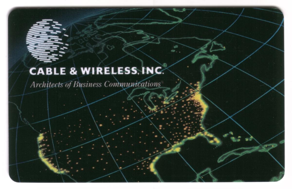 The top left corner of the card displays the Cable & Wireless, Inc. logo, which consists of a stylized globe made up of horizontal white lines. Below the logo, the text reads "CABLE & WIRELESS, INC." followed by the slogan "Architects of Business Communications" in a smaller, elegant font. Both the logo and text are printed in white, providing a clear contrast against the dark globe and map background.