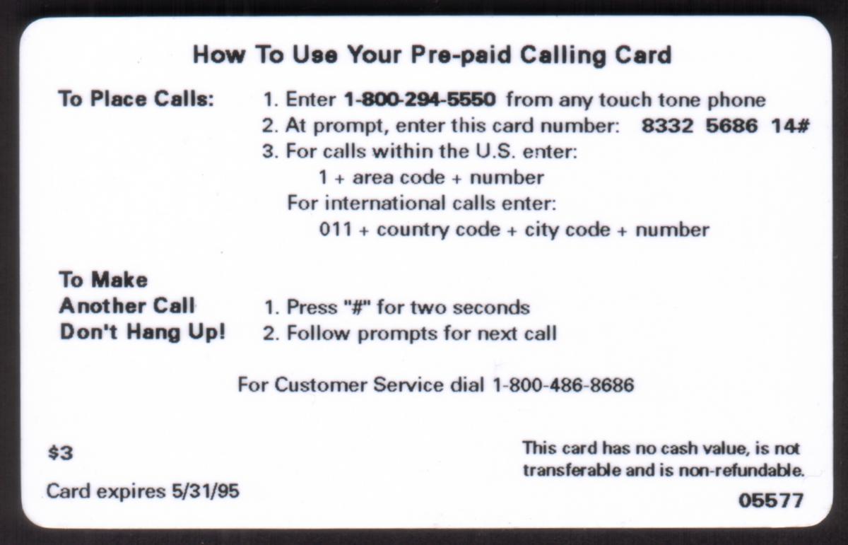 Since we have the world's largest inventory of USA phonecards for collectors, you will not necessarily receive the identical serial/batch/PIN number that we have scanned/pictured.