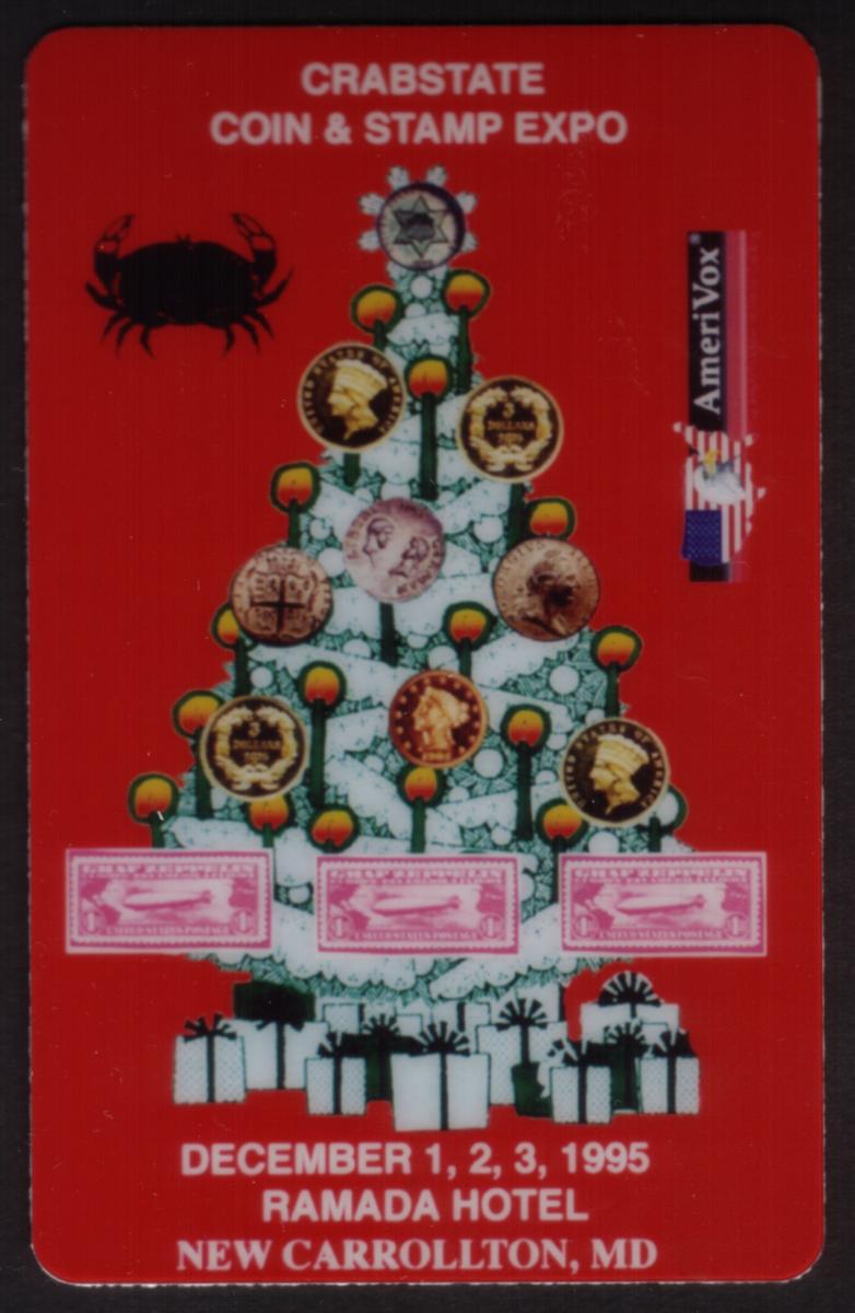 Vibrant 1995 Maryland coin and stamp expo card featuring a Christmas tree adorned with historic coin images, stamps, and Maryland''s iconic blue crab. |