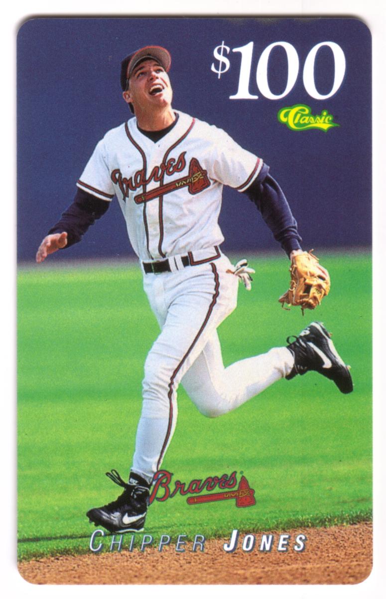 The card displays a monetary value of $100 prominently in the upper right corner, with the word "Classic" written in green and yellow script beneath it. The Atlanta Braves team name and logo are positioned near the bottom center, just above the name "CHIPPER JONES," which is printed in silver and white capital letters. The image conveys a vibrant, outdoor sports setting with a green grass background and a dirt infield area.