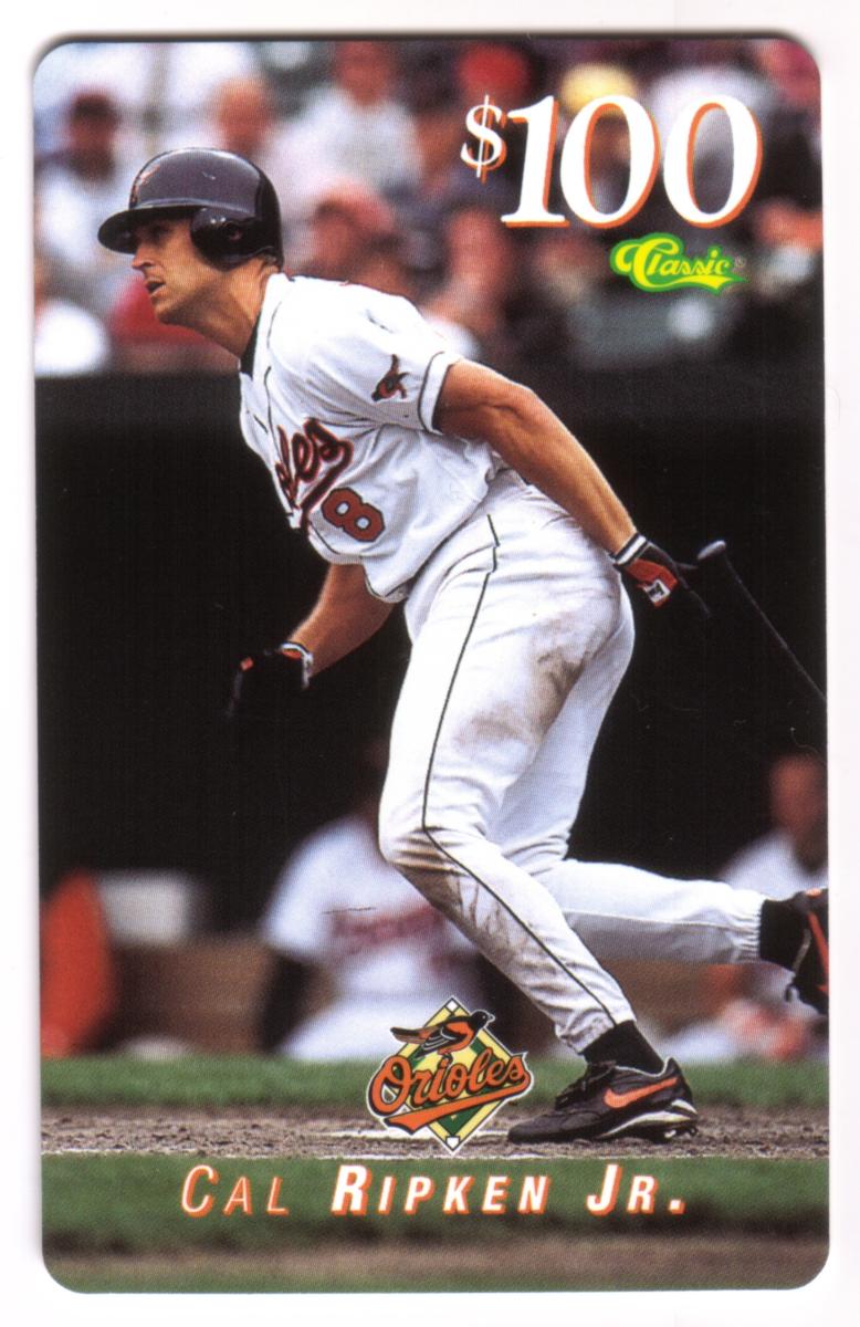 The card includes a prominent "$100" value at the top right corner, indicating its denomination as a collectible or prepaid card. The word "Classic" appears just below the value, suggesting a series or branding element associated with the card's issuance. At the bottom center, the Baltimore Orioles team logo is displayed above the player's name, “CAL RIPKEN JR.,” printed in uppercase letters with contrasting colors for clear readability.
