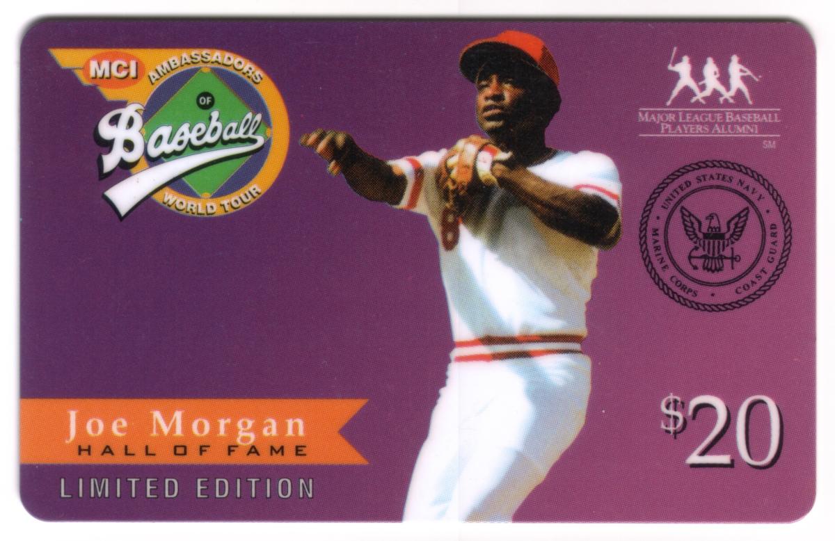 The card includes multiple logos and text. On the left side, there is an orange and green circular logo with the words “MCI Ambassadors of Baseball World Tour.” Below this logo, an orange banner displays "Joe Morgan Hall of Fame" in white text. The bottom left corner of the card also includes the words "Limited Edition." On the top right side, there are two additional logos: the Major League Baseball Players Alumni logo, which features three stylized baseball players in motion, and the emblem of the United States Navy, Coast Guard, and Marine Corps with an eagle and anchor in black.