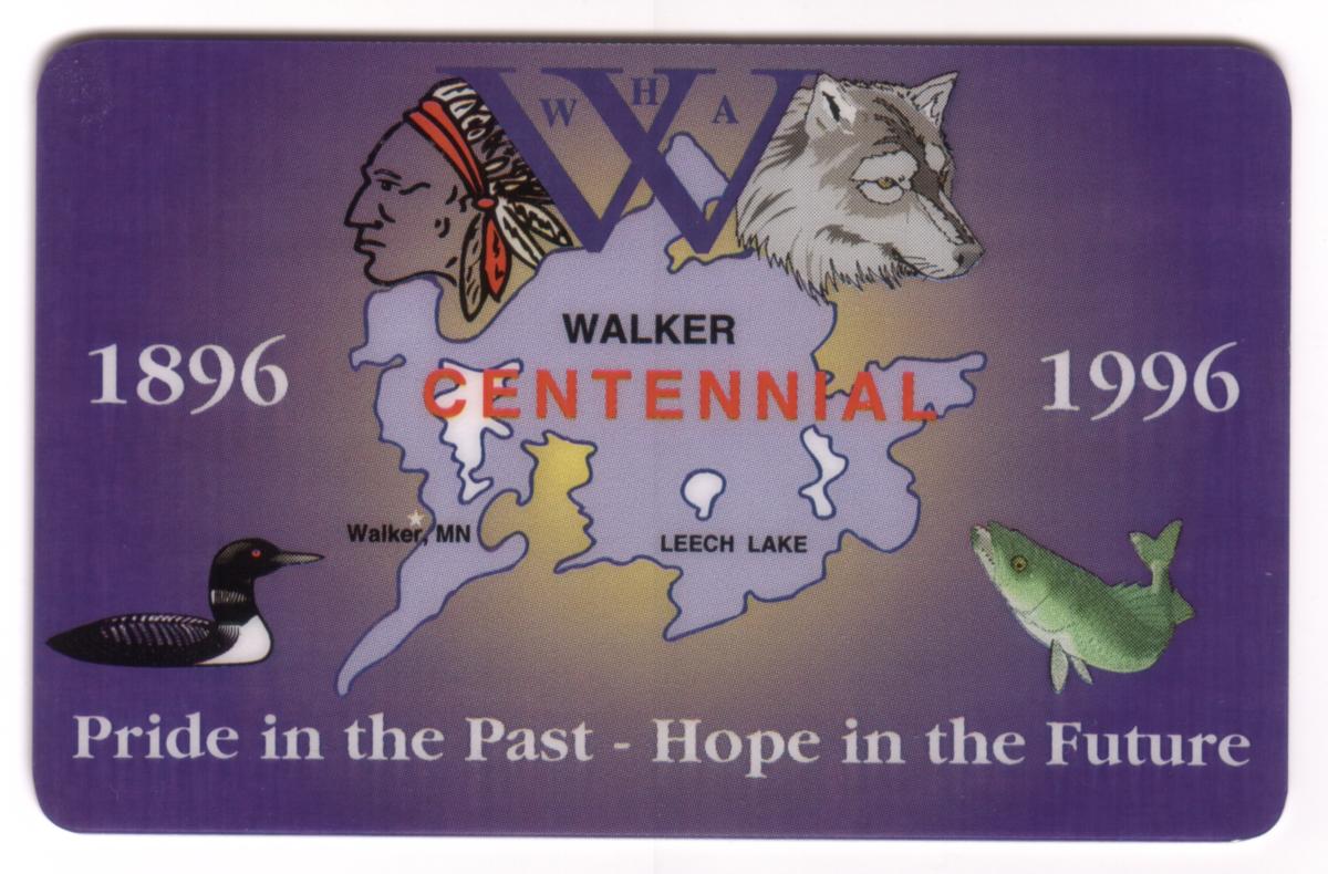 This collectible card commemorates the Walker Centennial in Minnesota, marking the years 1896 to 1996. At the center of the card is a simplified map outline of Leech Lake, with the names "Walker MN" and "Leech Lake" clearly labeled. Above the map is the logo "WHA" in a triangular design with crossed elements in blue. Flanking the map on either side are two prominent images: on the left, the profile of a Native American man wearing a feathered headdress, and on the right, the head of a wolf.