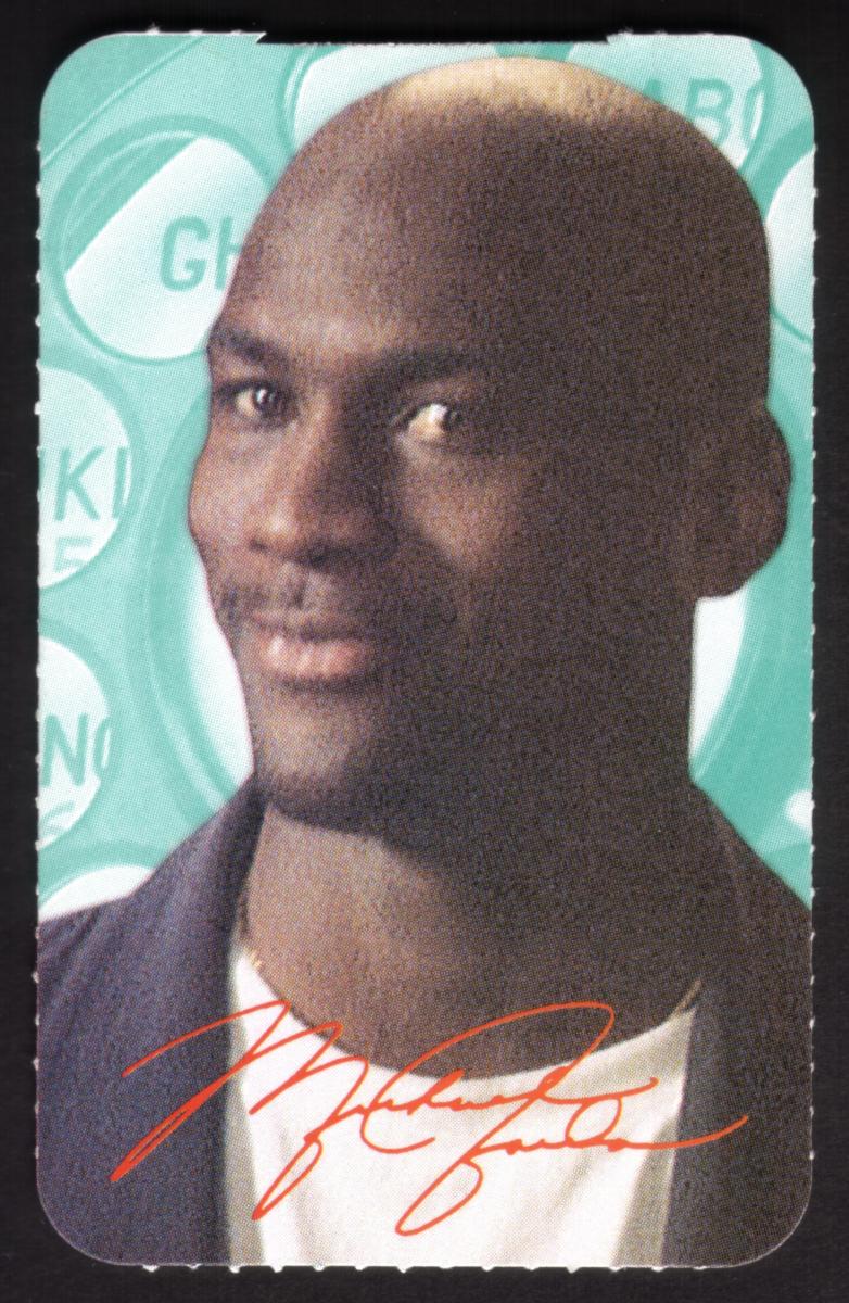 This collectible card features a photographic image of Michael Jordan, the famous professional basketball player and NBA icon. The image shows a close-up portrait of Jordan with a slight smile, looking slightly to the side. He is wearing a dark jacket over a white shirt.