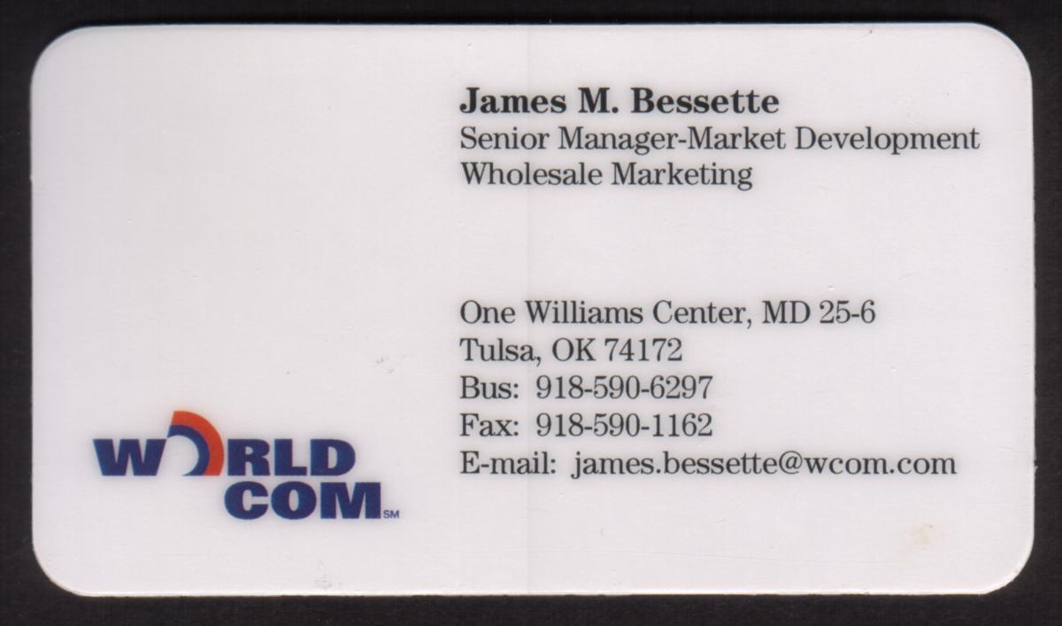 The overall design is clean and businesslike, emphasizing the corporate identity of WorldCom and the professional role held by James Bessette in Wholesale Marketing. The card’s layout balances the logo and textual information clearly without additional images or embellishments.