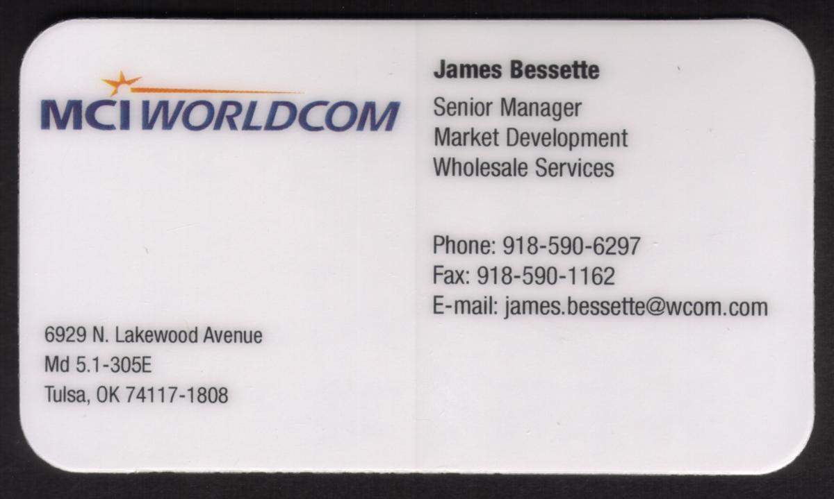 This is a promotional business card from MCI WorldCom dated 1997. It was handed out by James Bessette, a Senior Manager in Market Development within Wholesale Services at MCI WorldCom. The card features the MCI WorldCom logo in the top left corner, with the text primarily aligned to the right.
