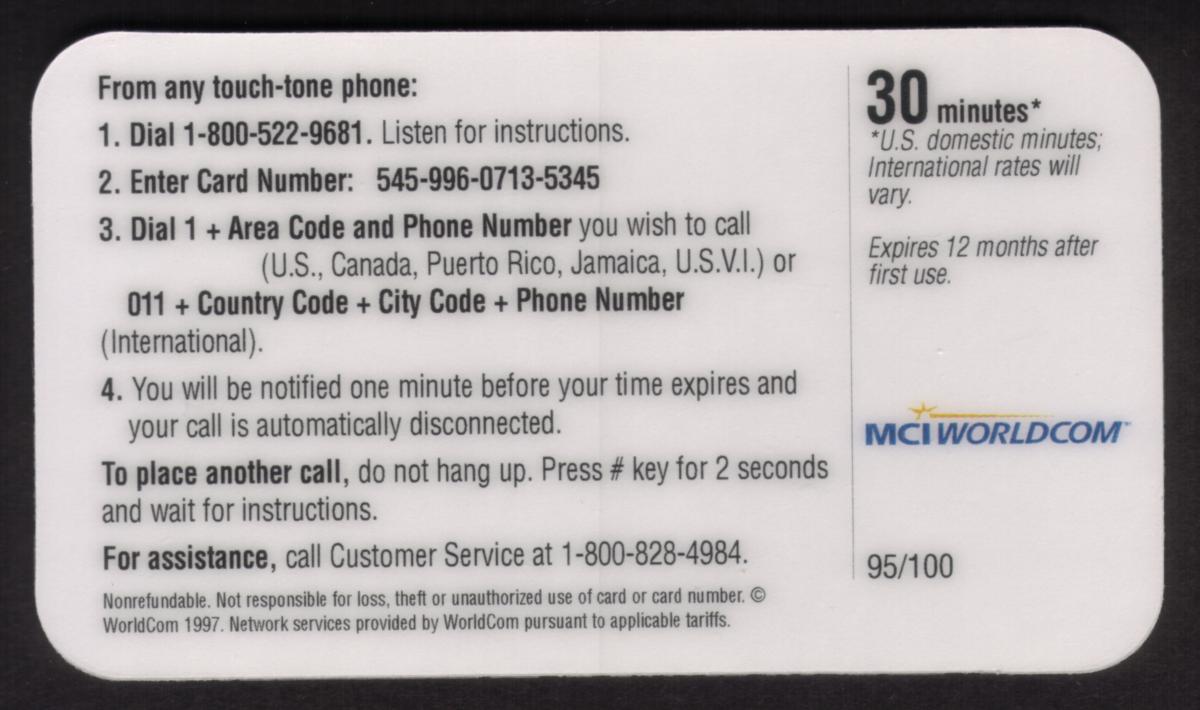 Since we have the world's largest inventory of USA phonecards for collectors, you will not necessarily receive the identical serial/batch/PIN number that we have scanned/pictured.