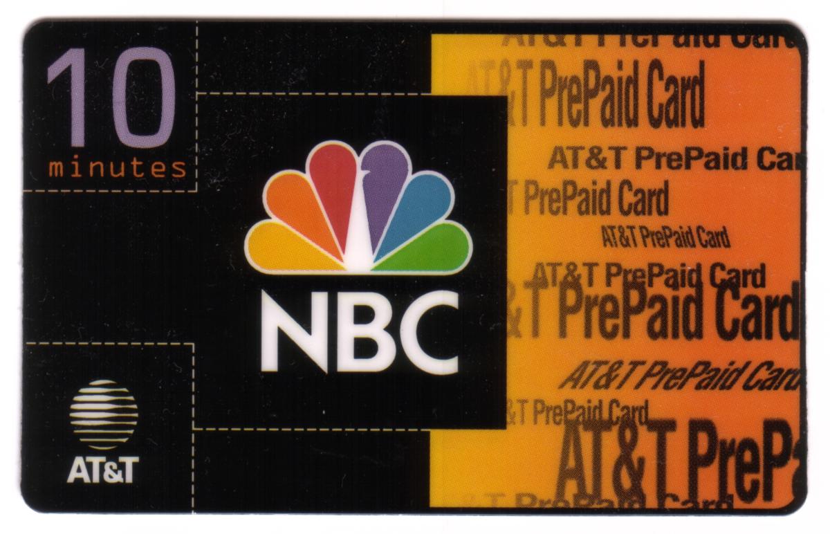 This collectible phone card features the NBC logo prominently in the center-left area, displaying the brand’s iconic multi-colored peacock emblem with white letters spelling "NBC" beneath it. The card is divided into two color sections: the left side is black and the right side is orange with repeated text "AT&T PrePaid Card" in various sizes and shades of black. The top left corner shows "10 minutes" in purple text, indicating the card’s usage time. The AT&T logo, consisting of a blue and white globe design above the text "AT&T," is placed in the lower-left corner of the card.