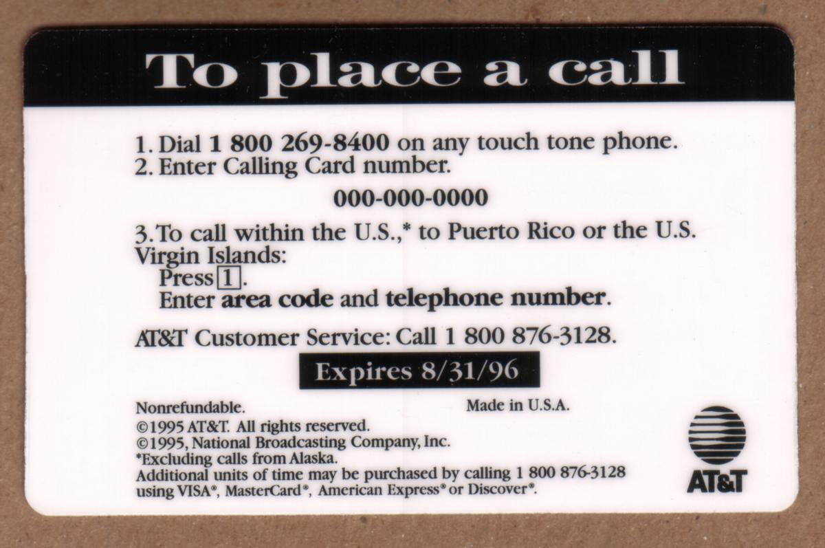There are no other characters or graphics on the card besides those described, making this collectible a clear representation of a 1995 co-branded promotional AT&T prepaid phone card linked to NBC News.