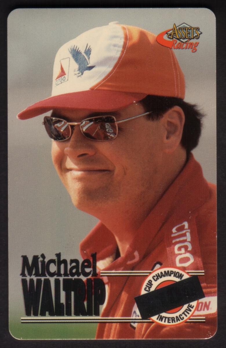 In the top right corner, the card has the "Assets Racing" logo in orange and green colors. The bottom left of the card displays "Michael WALTRIP" in bold black lettering. Below his name, there is a circular emblem with the words "CUP CHAMPION INTERACTIVE" surrounding it, with part of the logo obscured by a black shape.