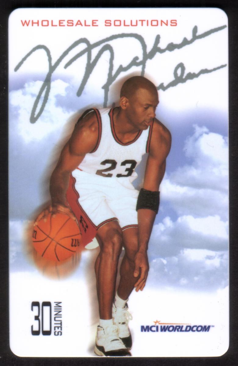 This card is identified with keywords including "promotional," "promo," "MCI WorldCom," "1999," "sports: basketball," and "Wholesale Solutions 30m Promo Michael Jordan Wholesale Solutions: Dribbling Basketball - MCI WorldCom."
