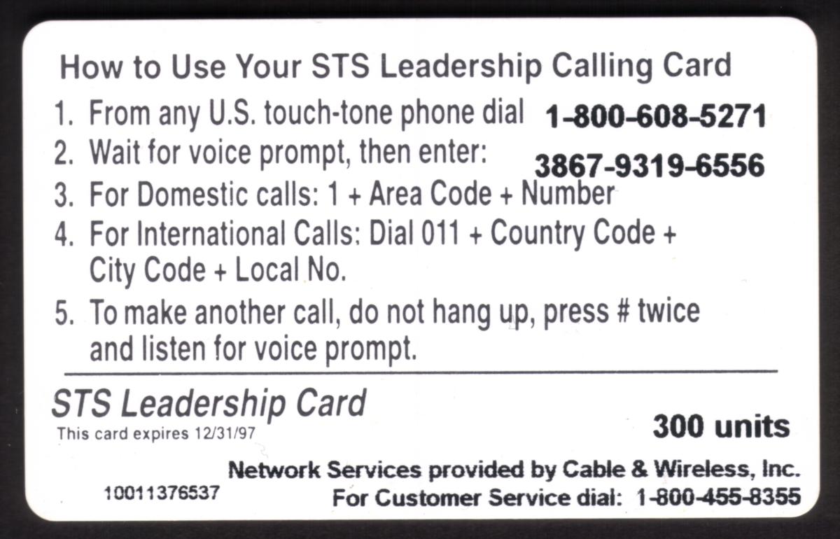 This card is associated with Strategic Telecom Systems (STS) and Cable & Wireless International (CWI), as indicated by the keywords. It relates to a premium promotional award from December 1997, specifically tied to STS Leadership efforts. The card signifies recognition within a corporate or organizational context, celebrating leadership and success.