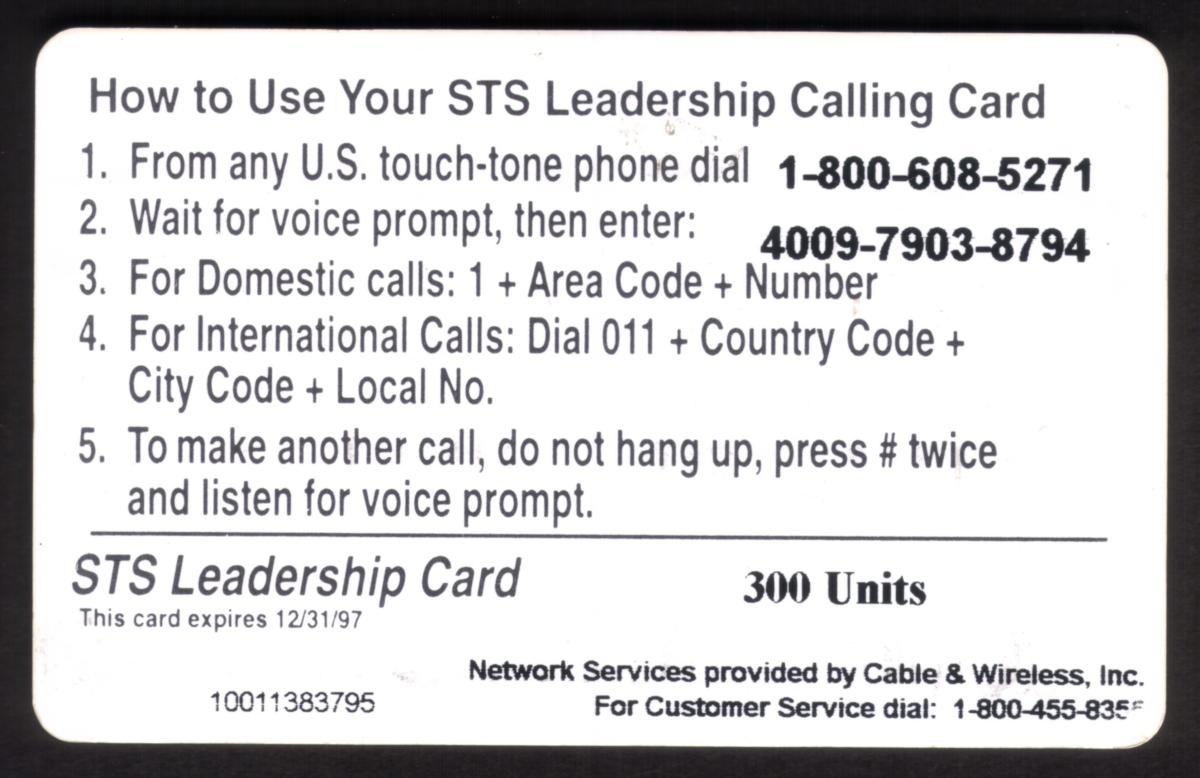This card is linked with Cable & Wireless and includes references to the STS award and CWI 300U. It corresponds to an STS Leadership Gold Colored award medal issued by C&W in December 1997. The card has been marked as used but maintains a clean presentation focusing on leadership and financial success.