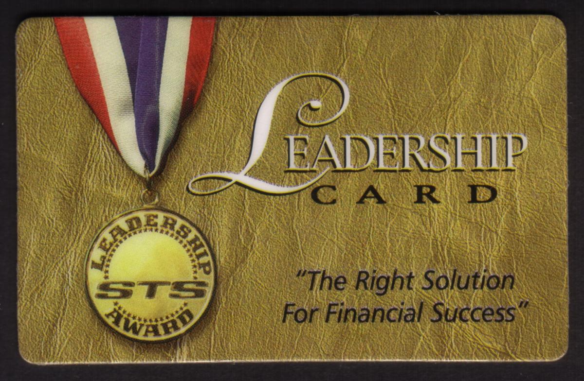 This collectible card is the STS Award Premium Leadership Card issued by Strategic Telecom Systems in December 1997. The card’s front features a distinctive gold-colored background resembling textured leather. On the left side, it displays a gold medal with the words "LEADERSHIP AWARD" encircling "STS" in bold letters, hanging from a ribbon with red, white, and purple stripes.