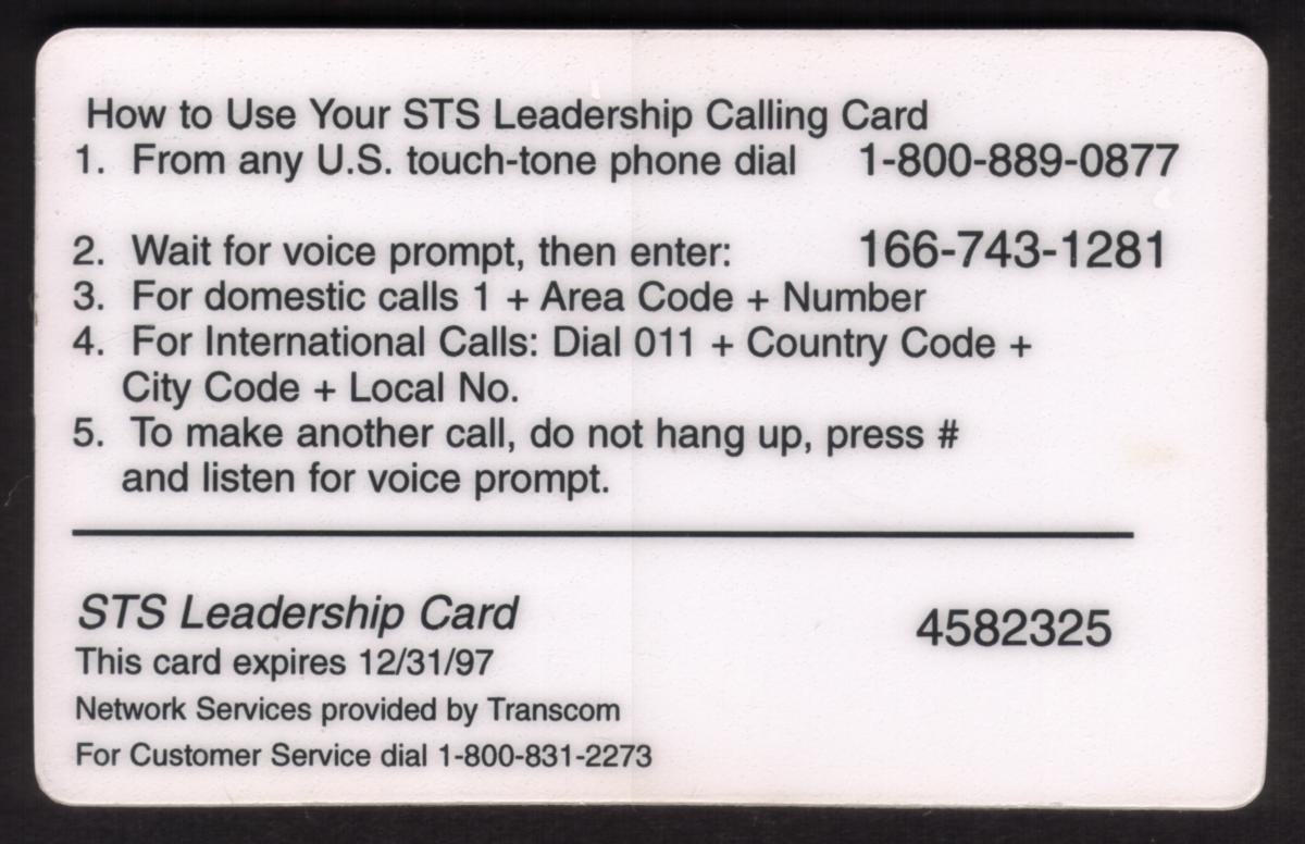"Transcom 12/97 USED" is noted, indicating the card’s issuance date and its used status, along with the full name of the issuing company, Strategic Telecom Sys. This card reflects a leadership award promotion by STS, highlighting its premium designation and financial success message.
