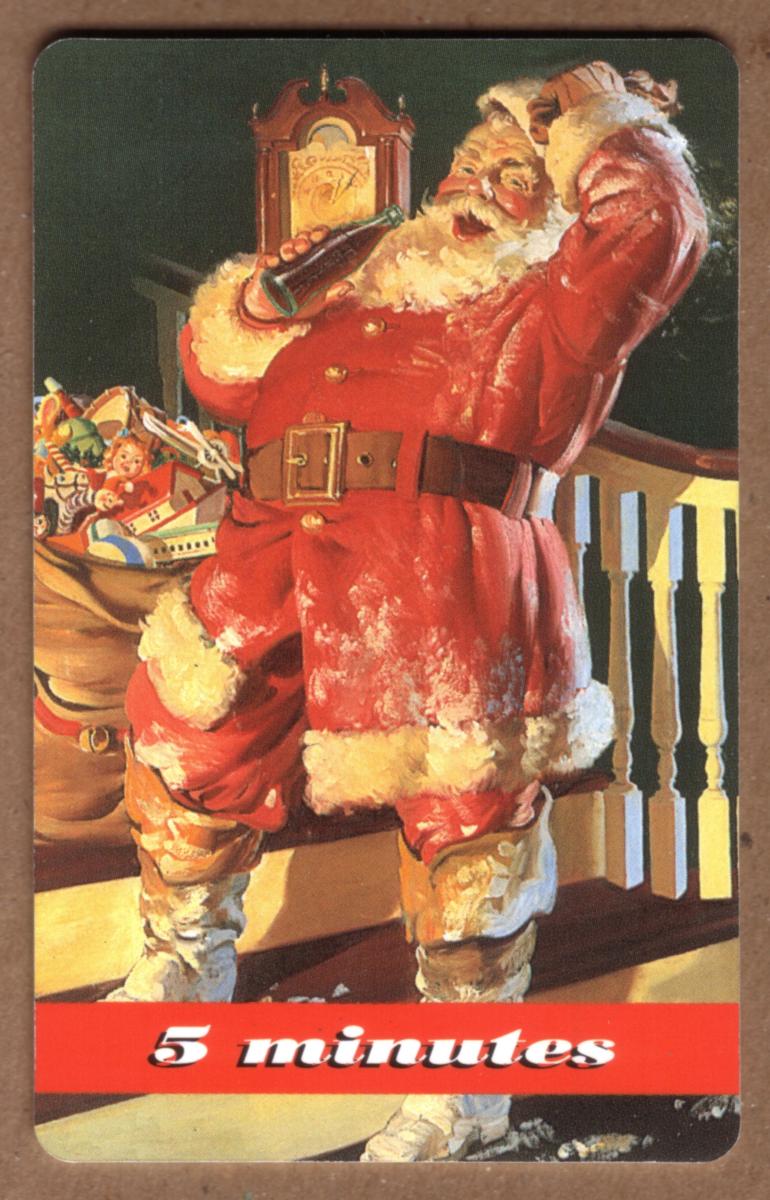 At the bottom of the card, the text "5 minutes" is displayed in white lowercase letters on a bold red banner. This phone card is from 1995, associated with Coca-Cola branding, as indicated by the presence of Coca-Cola logos and the iconic image of Santa Claus holding a Coke bottle. The card’s design clearly emphasizes Christmas and holiday themes.