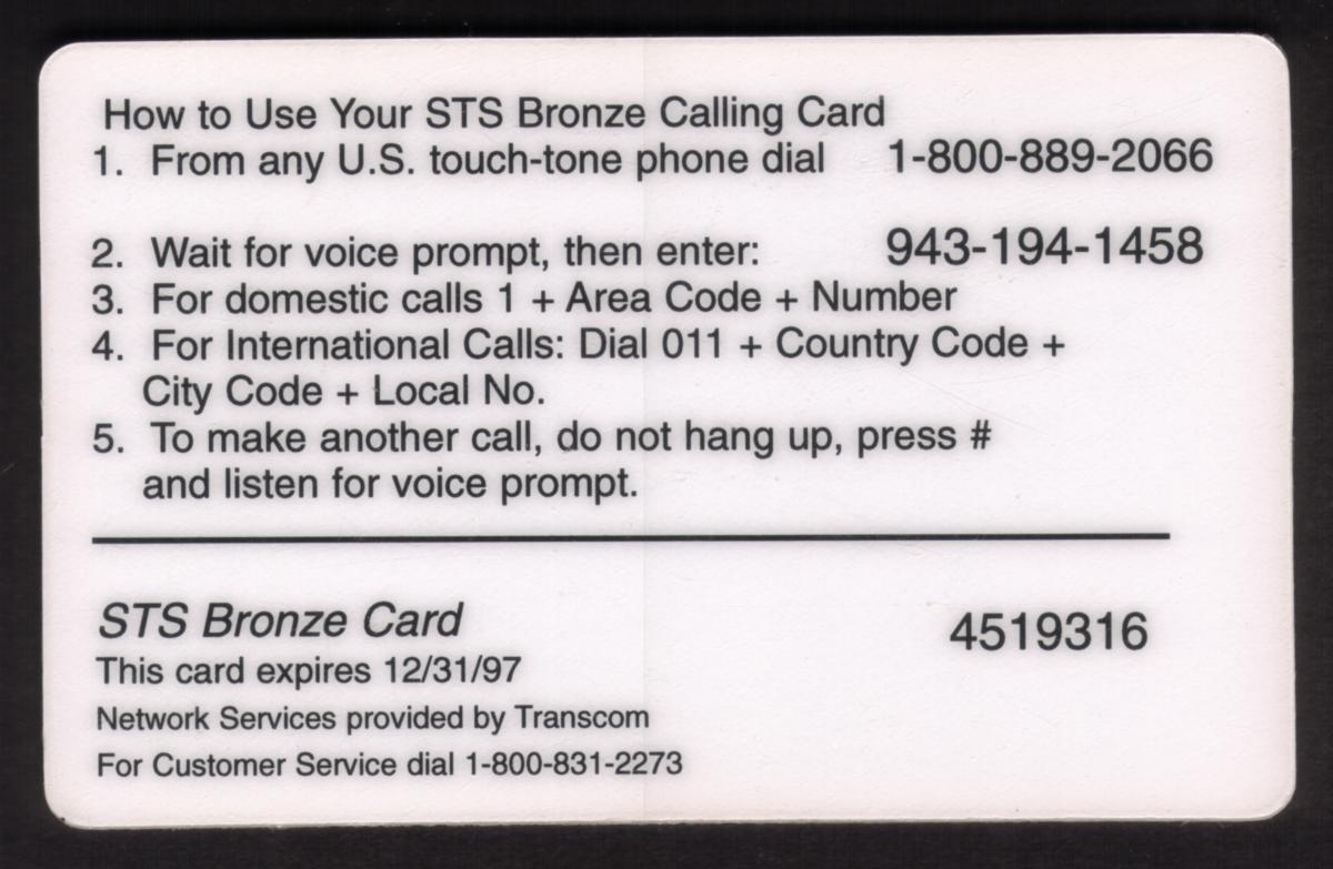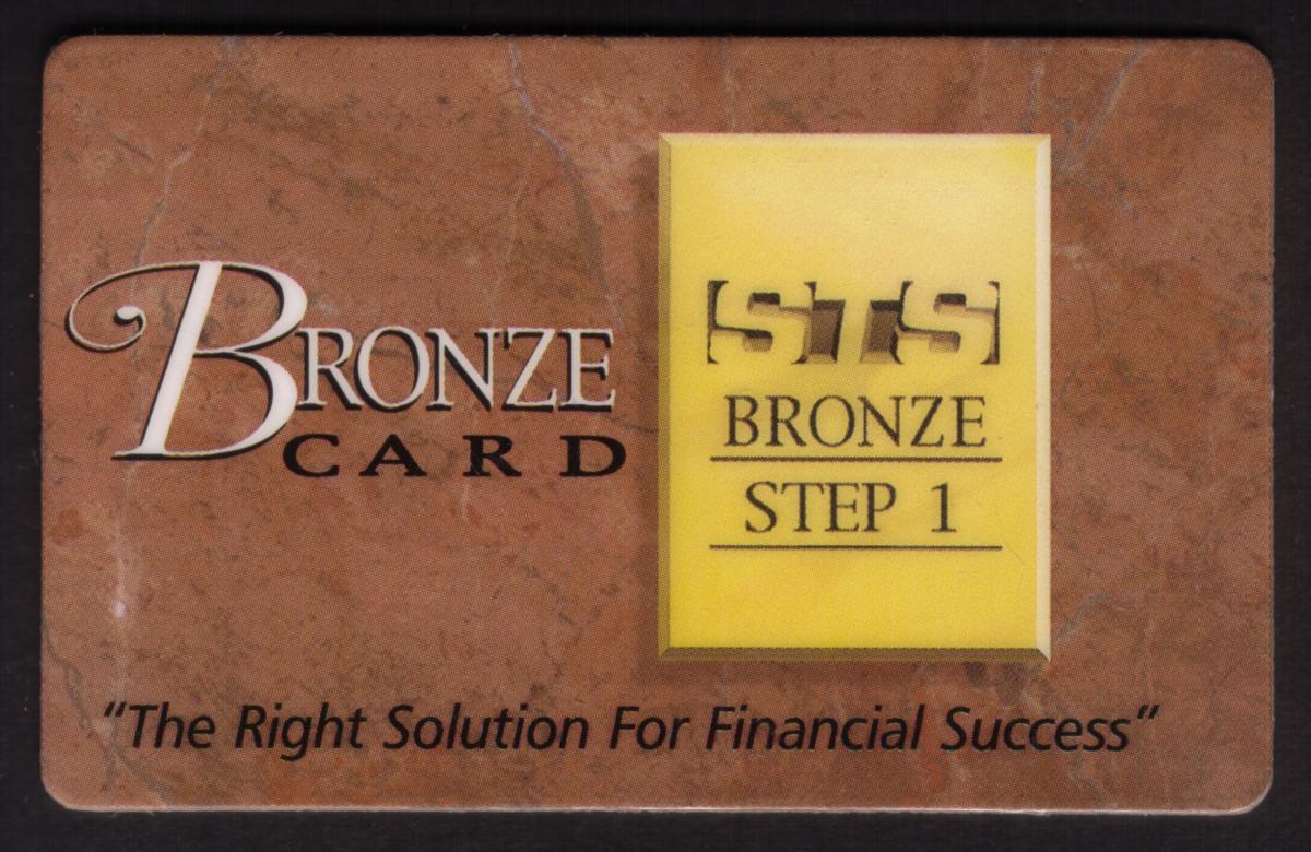 The card is identified with details connected to Strategic Telecom Systems. The text and design elements suggest it is a promotional or award card known as the STS Bronze Step I, dated 12/31/97 and linked to Transcom. The overall presentation highlights its purpose as a recognition or financial achievement token.