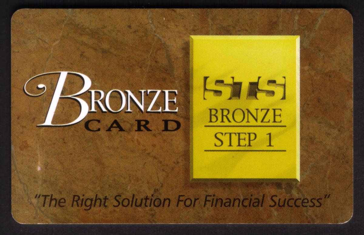 Below these elements, the card bears the phrase "The Right Solution For Financial Success" in black italics centered near the bottom. The design overall is clean and professional, emphasizing the STS Bronze Step 1 status and its association with financial success and achievement.