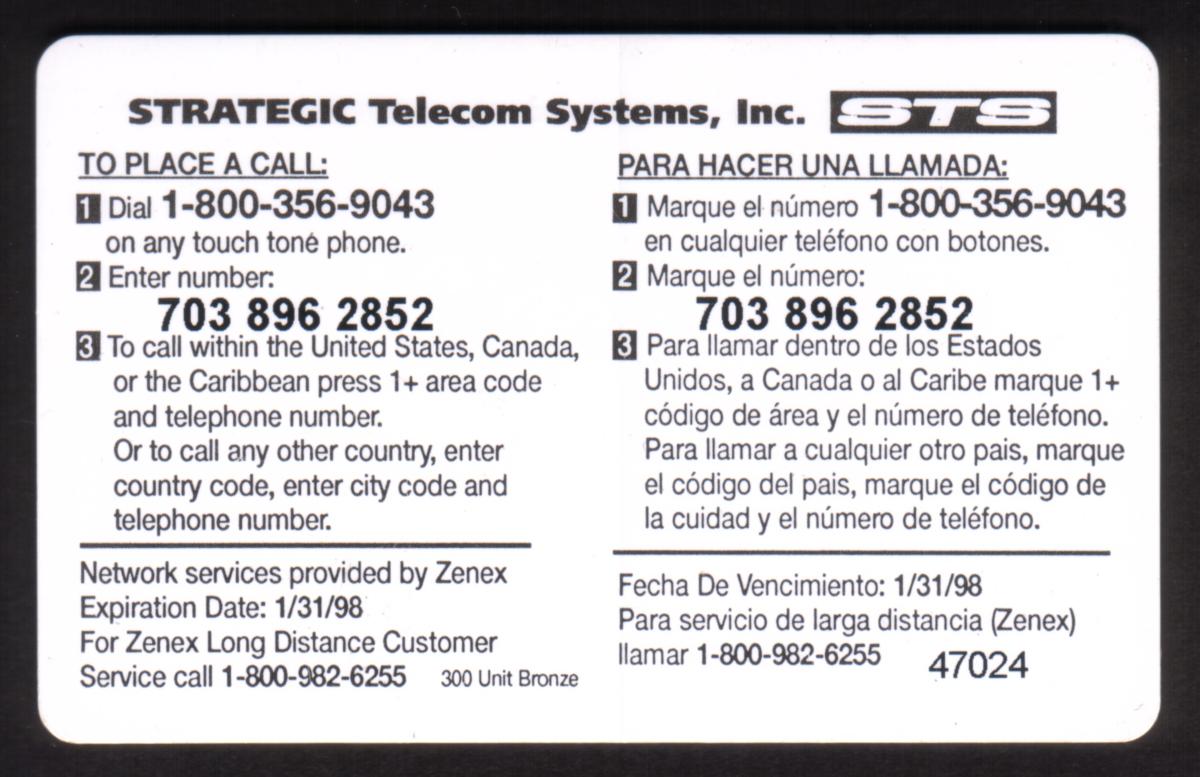 This card is linked to Strategic Telecom Sys. and uses the branding "STS" prominently, affirming its role as a promotional or award premium item. The date "Zenex 1/31/98 USED" along with the other specific identifiers indicate its issuance or use date connected to this financial or telecom-related program.