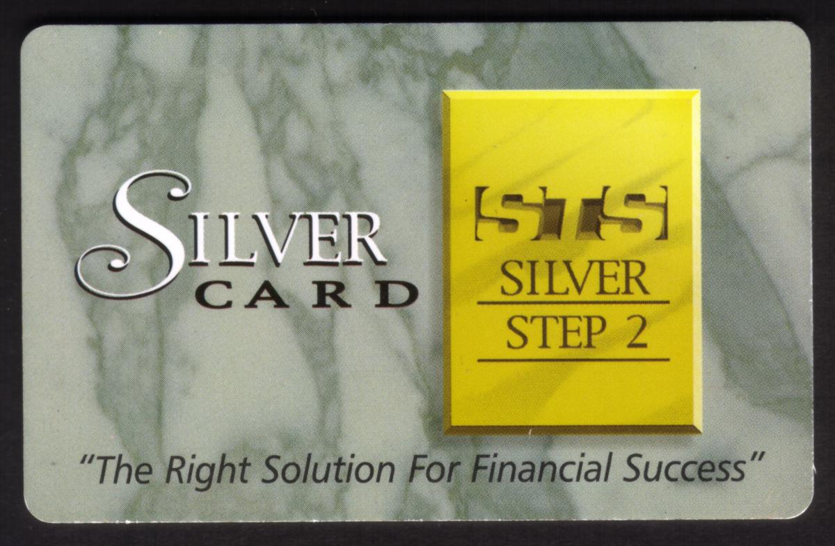 Overall, this collectible promotional card presents a professional and sleek aesthetic focusing on financial advancement and the STS Silver Step 2 program, embodying its slogan and branding in a clear and straightforward manner.