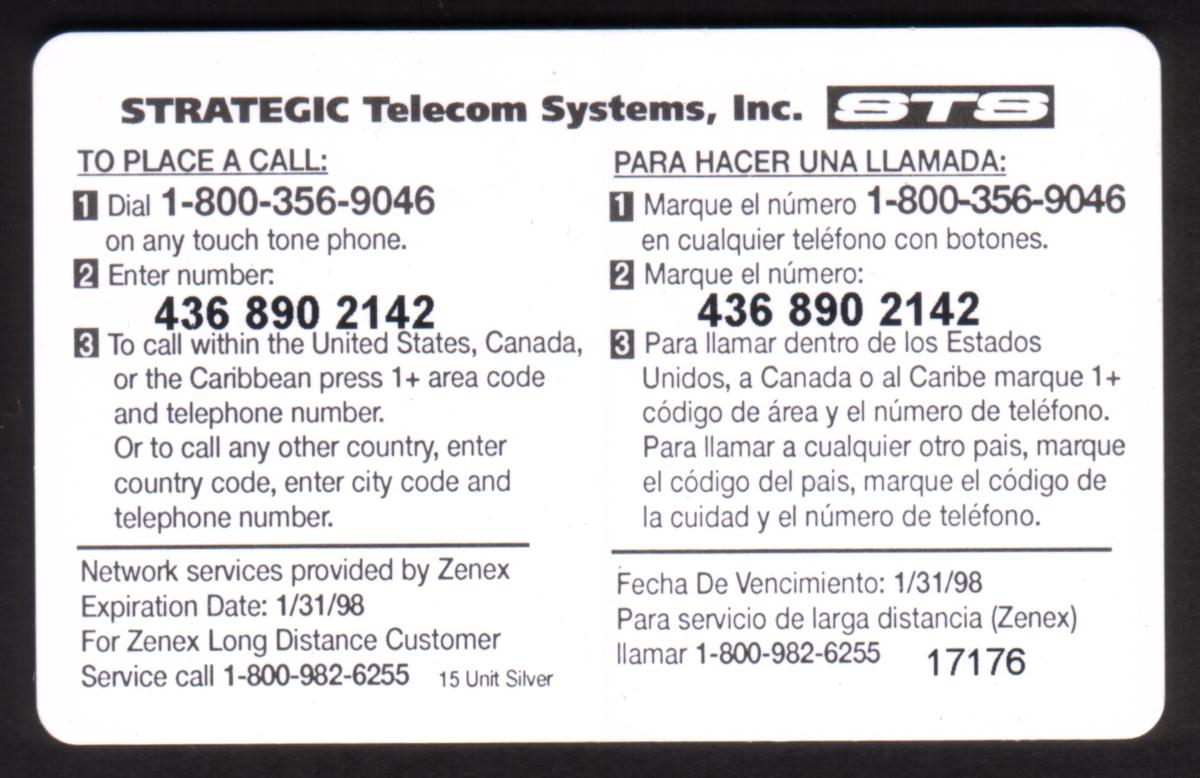 The card’s design emphasizes the STS award premium and is connected to Strategic Telecom Systems, as indicated by the keywords. The date "Zenex 1/31/98" suggests a specific issue or usage date related to this collectible. This card is identified as a promotional item linked to Strategic Telecom Systems, reflecting a financial or reward theme associated with success and achievement.