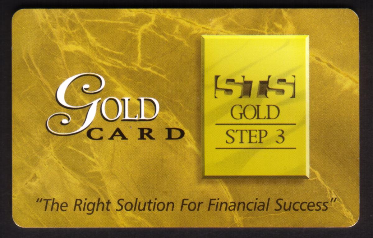 This collectible card prominently features a gold-themed design with a textured gold background. The left side of the card displays the text "Gold Card" in a decorative font, where the word "Gold" is stylized with a cursive capital "G" and the rest in serif uppercase letters, while "CARD" is written below in a classic serif font. On the right side, there is a yellow rectangular block with a subtle shine effect containing the text "[STS]" in a bold, black, stencil-style font. Below this, the words "GOLD" and "STEP 3" are printed in elegant uppercase serif letters, stacked vertically and centered within the block.