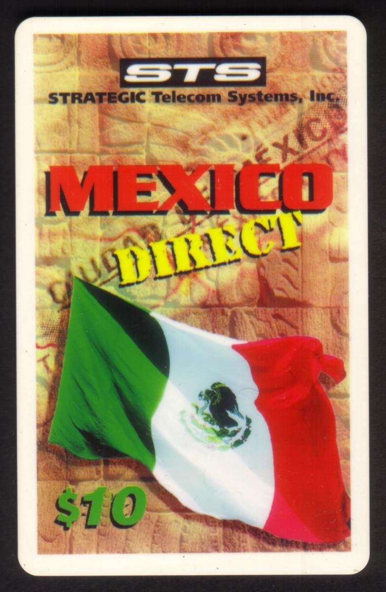 At the top center, the logo for Strategic Telecom Systems, Inc. (STS) is displayed with "STRATEGIC Telecom Systems, Inc." written directly below it in black text. The words "MEXICO DIRECT" span across the middle of the card, with "MEXICO" in bold red capital letters and "DIRECT" stamped diagonally in yellow with a slightly distressed look. The card’s value "$10" is printed in green in the lower left corner.
