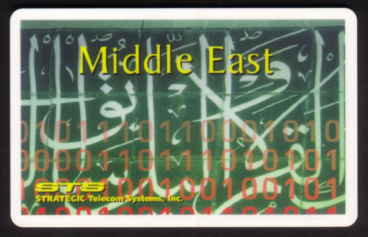 This collectible phone card displays the text "Middle East" prominently in yellow at the top center. The background features a green digital design with red binary code (ones and zeros) overlaying white Arabic letters that are scattered and partially connected, creating a layered visual effect. The lower left corner contains the logo and text "STS STRATEGIC Telecom Systems, Inc." in yellow.